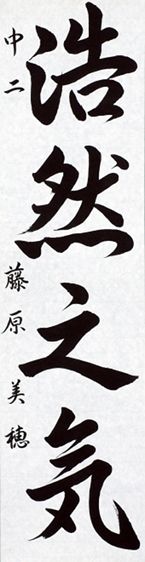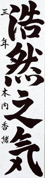 この度奨励賞をいただきありがとうございました。受賞を聞いた時は、本当にうれしかったです。今回、私は「浩然之気」という言葉を書きました。作品を仕上げるために何枚も書きました。書いている時に苦労したのは「然」という字のバランスです。台形のように上より下が広がる所が難しく、先生にアドバイスをいただきながら何度も練習しました。そして上達した時は大きな達成感を味わうことができました。また、私は「之」という字を初めて習字で書きました。見た時は上手く書けるかと不安でしたが、とても楽しく書くことができました。なぜかというと、「浩然之気」の中で右はらいは「之」の三画目のみで、伸びやかに自分らしくをこの一筆に込められるからです。自分なりに気持ちを込めて書けたと思います。