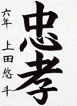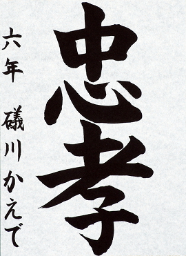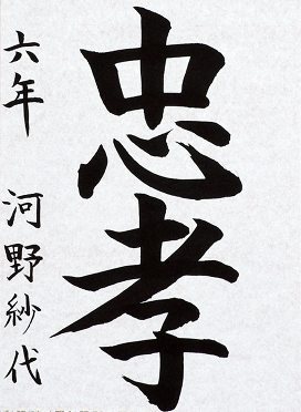 同じく「奨励賞」となった上田悠斗さん、上川友莉さん、河野紗代さん達の作品「忠孝」は、筆の持ち方や運び方、そして文字の組み立て方、全体のまとめ方も大変よく書けています。一心不乱の心意気にも好感が持てるところです。なお、学年や名前も作品の一部です。さらに練習を重ねて強く美しく書きましょう。上田さんの作品は穂先に気持ちと全神経が注がれて、心地よい緊張感があふれています。上川さんの作品は直筆による弾力が効き、深さと力強さを醸しています。河野さんの作品は丁寧な筆使い、緊密な組み立て方で理知的な趣が漂っています。
