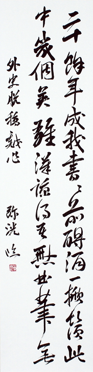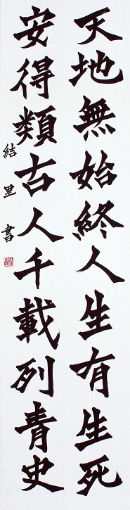 行書で書いたのは、水の流れのような時の流れを表現したかったからです。そして、聖賢のような人物になりたいという固い意志が表れるように、力強さが線の奥にある字を書きたいと思い、練習しました。字形は「蘭亭序」「集字聖教序」を参考にして考えました。字の配置は一行に二句を二行にして紙に収めました。一句が途中で切れずに読めるようにしました。墨つぎも詩の意味と紙へ収めたときにいろんな表情が見えるように工夫しました。練習しているとき、字に流れを出すことが難しかったですが、詩の意味を考え、頼山陽の気持ちを想像しながら書きました。すると、からだと筆が一つになって、流れが出てきたように思いました。線の重厚感が出るように、特に固い意志を表したい最後の句は速さを少しゆっくりにして書きました。練習を重ねていったら、だんだん私が表現したかったものに近づけたと思います。