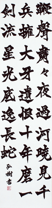 「広島県教育委員会賞」となった、東弥洸さんの「修史偶題の一首」の臨書は一筆一筆の線や一字一字の結構はむろん優れていますが、行を書き貫く気脈と筆力が高く評価できます。特に二行目が快調で見事です。正鋒懸腕による運筆が凛とした風趣を醸しています。頼山陽の“風骨”に通じる臨書作品です。落款の名前はさらに吟味と工夫をしてください。