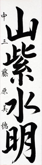 「山紫水明」を書くにあたって、苦労したところは、文字のバランスです。この言葉は画数の差があるので、画数の少ない文字が大きくなりすぎないように、注意して書きました。なかなか上手くいかなかったのですが、納得のいく文字になった時には、大きな達成感を感じることができました。