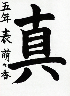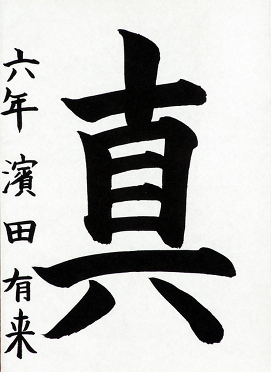 「真」という字は、かんたんだと思っていたけど、むずかしかったです。とくに、右上がりの所です。私は、右上がりがにがてなのでがんばりました。あと、はん紙いっぱいに大きく大きく書くこともがんばりました。このことを、心がけてやったら「真」がうまく書けました。来年も、選ばれるように、練習をがんばっていきたいです。