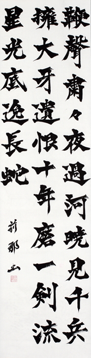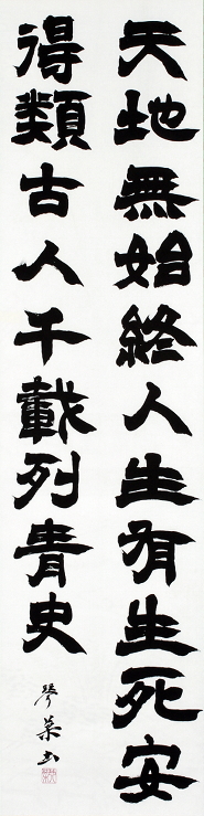 私は、北魏時代の古典を基調とした倣書作品にしました。一画一画を、蔵鋒で入ることで、線質を強くしました。また、北魏の特徴である横画、転折などで、迫力を出しました。墨量に注意し、かすれを少し出すことで、重たくなりすぎないようにしました。作品構成は、横そろえにし、字間に空間を空けることを工夫しました。頼山陽の書の精神に通じるような強い線で書くことを勉強していきたいです。