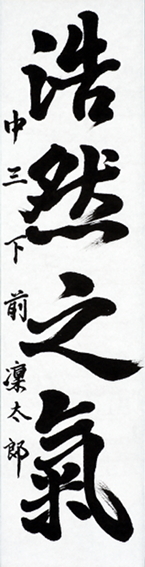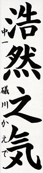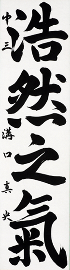 同じく「奨励賞」の溝口真央さんの作品は、筆法・気脈・構成の三拍子がそろった力の溢れる堂々たる秀作。特に「浩然」「氏名」の運筆や均衡は見事です。「気」字は結構に工夫が要ります。書道字典や法帖から先達の知恵を吸収しましょう。