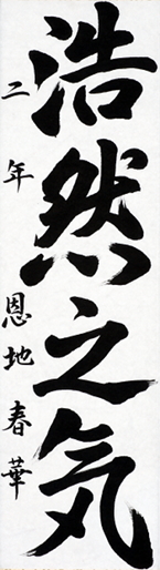 恩地春華さんの作品は意気旺盛、運筆快調の傑作。「浩然」は技量もすばらしいが、筆意気宇はそれ以上で見ごたえ充分。下部の「之気」は結構を工夫し、筆脈を貫通させましょう。吟味する力も併せて習得しましょう。