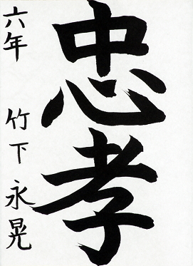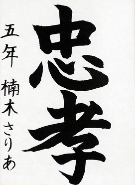 ぼくは、「忠孝」と書きました。忠という字は、中の間の広さがせまかったり、左右でちがったりして、初めは上手には書けませんでした。でも、線の太さに気をつけて、がんばりました。孝という字は、土のそりと左はらいがむずかしかったです。
