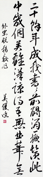 「奨励賞」となった、今重美優さんの作品は端正且つ清澄な線質で、書き出しから落款まで颯爽と筆を運び、詩意を想起させる秀作。特に二行目が快調、正鋒懸腕による運筆で凛然とした風趣が見て取れます。さらに“意連”の会得を期します。