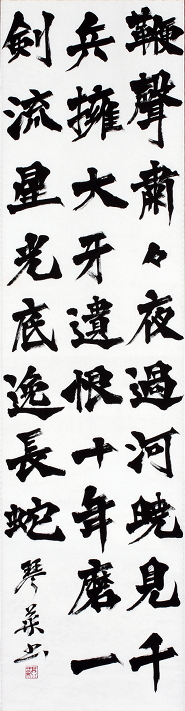 仁科琴菜さんの作品は北魏の書法で作品化した秀作。蔵鋒による起筆、骨力に満ちた転折、大胆な運筆には気が横溢しており、山陽の詩境を想起させ見事です。