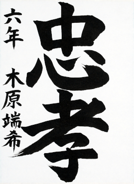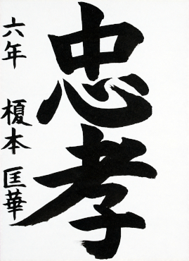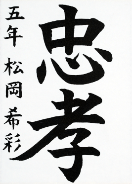 今回、素晴らしい賞を頂き、とてもうれしく思います。「忠孝」では、点のはねや間かくなどバランスに気をつけて書きました。また、一生けん命書いたので努力したかいがありました。小学校最後の一年で書道の良い思い出に残りました。