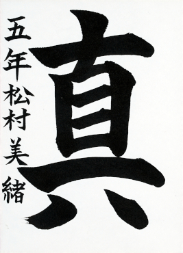 私は、「真」という字の意味のように、真っ直ぐな気持ちで、じく線が通るように注意して書きました。また、一画一画が力強くなるよう、止めやはらいを意識しました。名前も「真」に負けないよう、のびのびと書けるように練習しました。