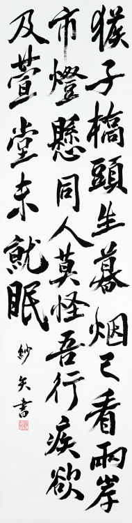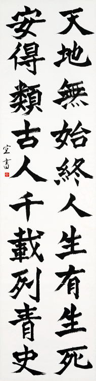 尾畑 空さんの「癸丑歳偶作」は北魏の石刻書の切り削いだ書風で、詩意に迫らんとする力作です。特に起筆部と波磔部は筆法と筆意とが渾然一体となってその効を発揮している。緊密な結体、揺るぎのない行構成、整然とした布置に集中力の高さが見て取れます。