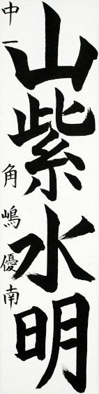角嶋 優南さんの「山紫水明」は書き出しから落款まできっぱりとして美しい秀作です。大きな気宇、清澄な質感は句境をも想像させる。特に「山紫」は端正な起筆と生気溢れる運筆で構成され見事です。書の黒と余白の白とが照応して大変に美しい。じっくり味わえる秀作です。