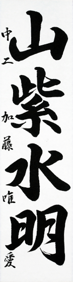 私が「山紫水明」を書く上で注意したところは、文字の大きさのバランスを整えることです。画数が多い字と少ない字があり、大きさがそろわないことがたくさんありました。ですが、何枚も重ねて書き、その都度作品を振り返ることで、納得のいく作品ができました。これからもたくさん書いてより美しい文字が書けるようになりたいと思います。