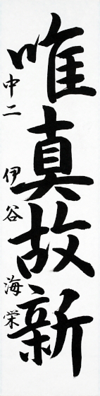 中学校部門は、楷書や行書、それぞれの書体の特徴をとらえた筆遣いがされていました。それらの中でも、「浩然之気」では、その言葉の意味でもある「この上なく大きく、強いさま」を表すような堂々たる作品、「山紫水明」では、「自然の景観の澄み切った美」を流れるような筆遣いで表現した作品、「唯真故新」では、「真似や嘘偽りを戒め、自分を飾らず、正直であること」を素直な筆致で表した作品と、それぞれの言葉のもつ意味に沿った表現が印象に残りました。