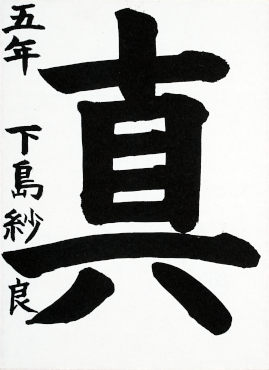 下島 紗良さんの「真」は堂々とした気構え、力強い運筆でバランスもよく取れた力作です。特に一画一画に向かう真剣さと、最後まで書き抜く集中力、紙面に向かう姿勢がすばらしい。
