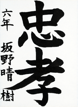 坂野 晴樹さんの「忠孝」は丁寧でしっかりした筆使い、書き出しから名前まで堂々と書き進めた力作です。全体のバランスも良く取れており、意志・気力が筆端からあふれています。