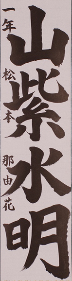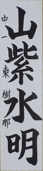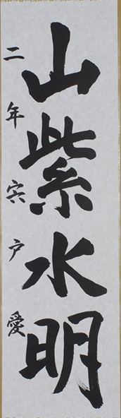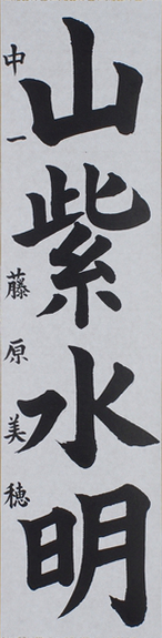 中学校部門は、自然の風景が清浄で美しいことを意味する「山紫水明」が課題でした。四字の中では、画数の多い「紫」と画数の少ない「水」の対比をバランスよく表すことが難しいと感じました。入賞した作品は、これらを見事に表現していると思います。