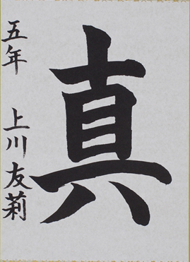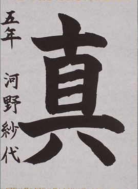「熊野町教育委員会賞」となった、礒川かえでさんの「真」は、筆の先に気と力とがピタッと宿り、真っ直ぐな気持ちで運べていること。また見事な組み立て方になっていること。大変に優れた作品といえます。