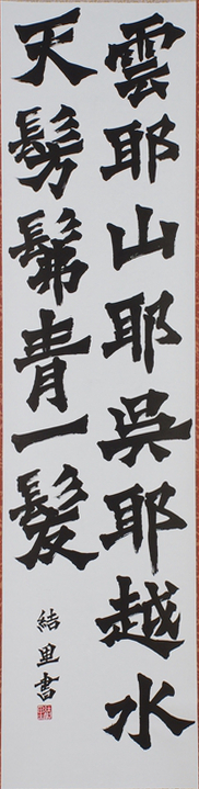 「頼山陽賞」となった、藤原千穂さんの「山紫水明」は「山」の書き出しから最後の名前の「穂」まで、非の打ちどころのない書です。字面上の難しさを克服し、落ち着いて筆を伸びやかに運ぶところには頼山陽のいう「自然の景観の澄み切った美しさ」にも通じる美しさがあり見事です。